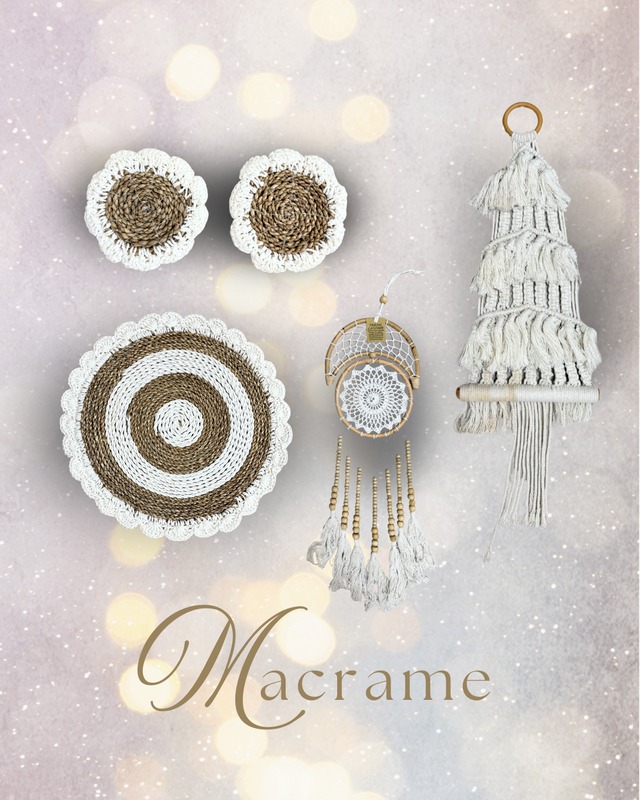 Christmas限定セットです。 こちらは【macrame】を集めました。 ☑︎マクラメツリー(下記の注意をご覧下さい)×1 ☑︎マクラメシーグラスコースター×2 ☑︎マクラメシーグラスランチョンマットD×1 ☑︎マクラメムーンドリームキャッチャー×1 合計 ¥15110の商品がお得なセットになっております。 各商品のサイズや詳細は商品ページよりご覧ください。 マクラメツリーは買い付け時から汚れがございます。神経質な方や綺麗な商品をお求めの方はご遠慮ください。 ⚠︎画像参照 ATTENTION ひとつひとつ手作りですので風合いや仕上がりにムラがございます。画像と同じ物は提供できませんのでご了承ください。多少の縫製や接着の粗さがございます。ご理解の上購入くださいませ。