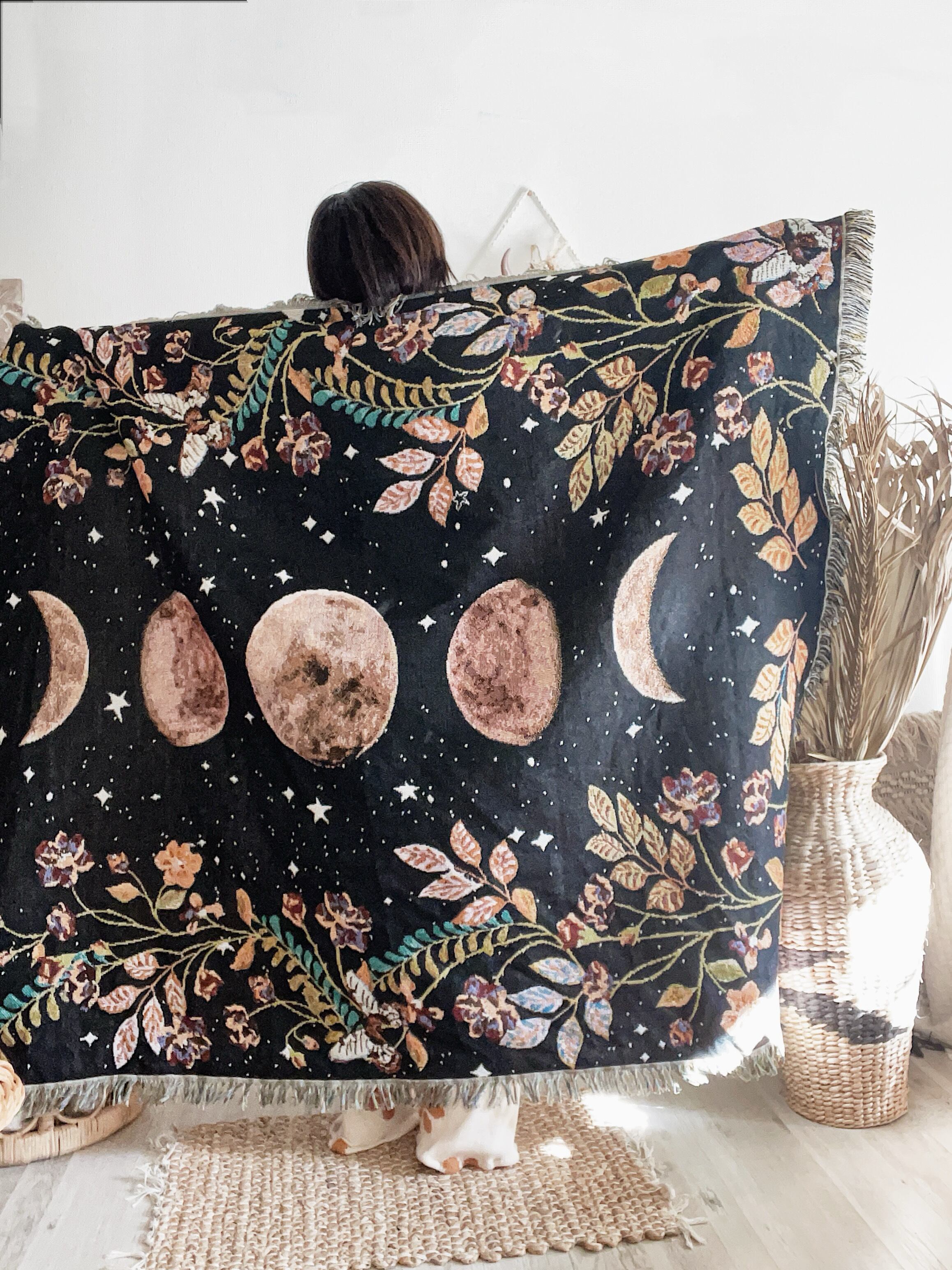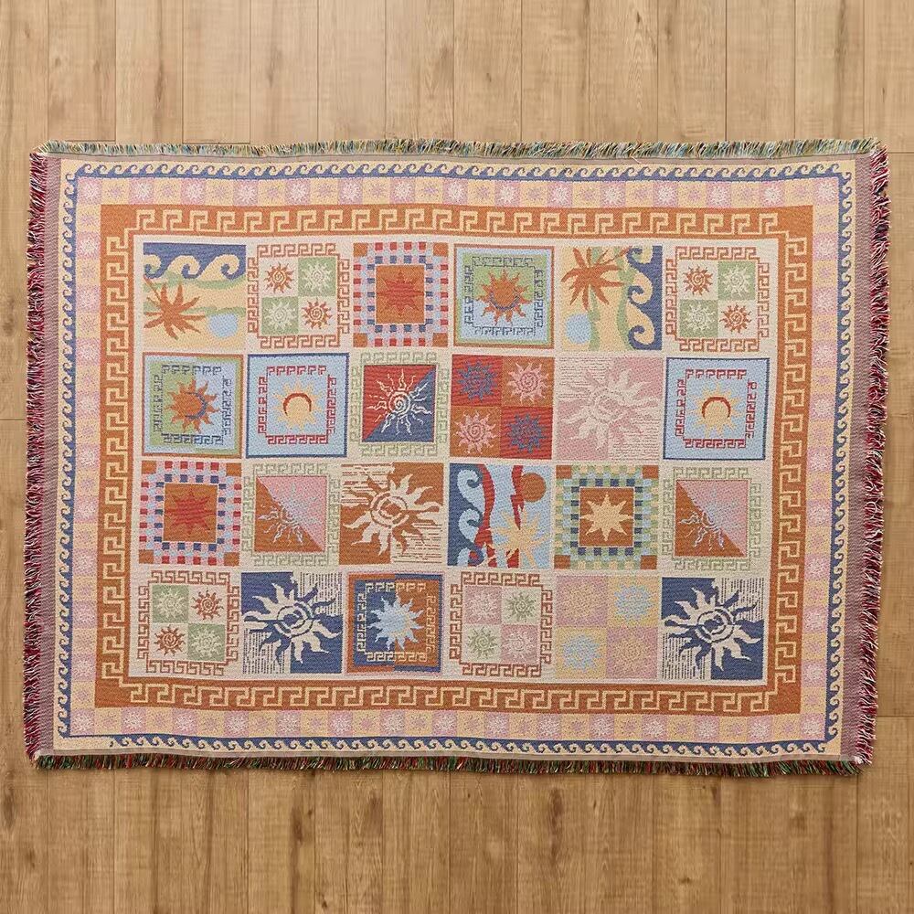 太陽と月、波のモチーフが落とし込められたビーチスローラグ。