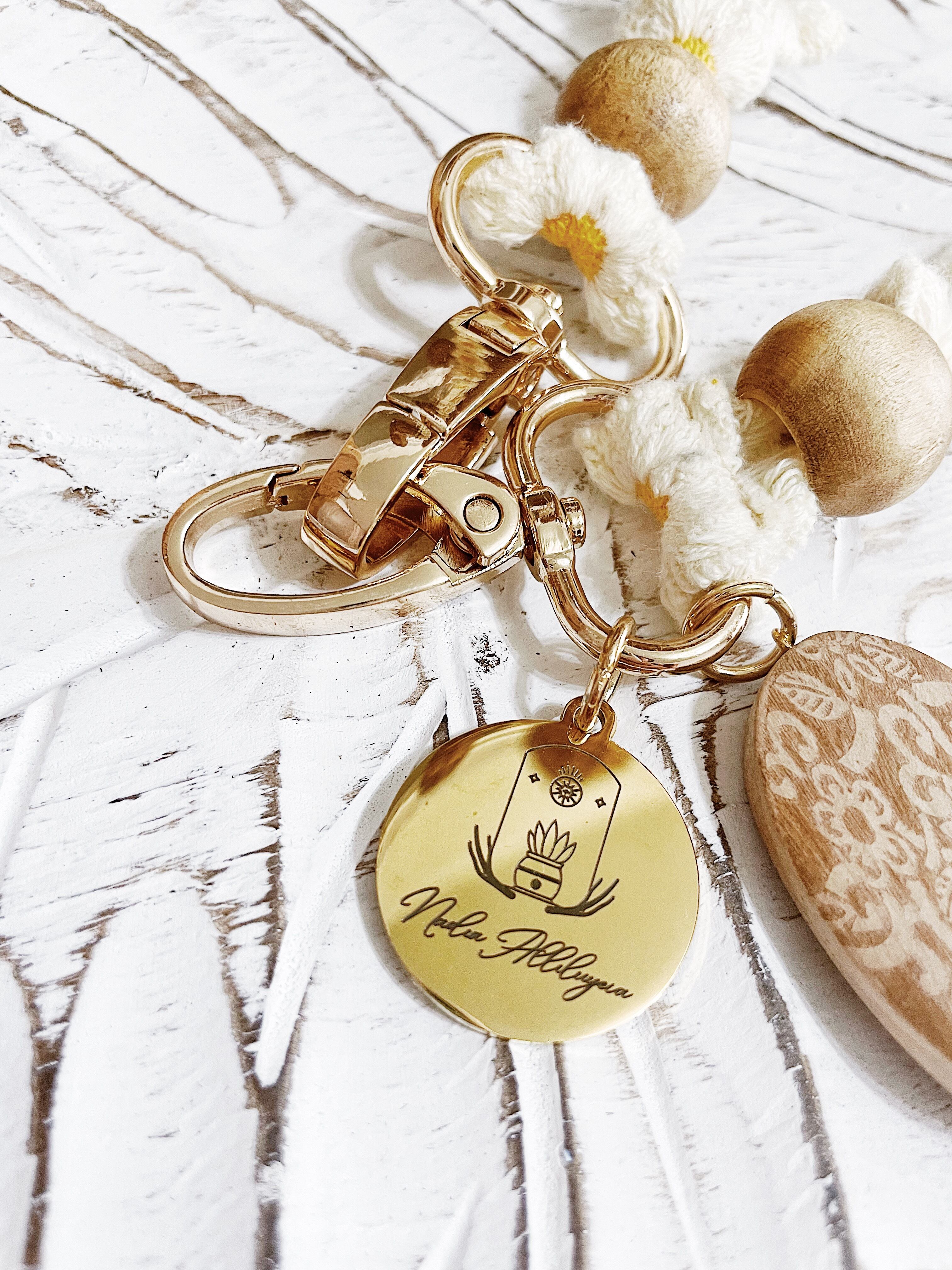 チャームには花のバーニングが施されたウッドチャームが付いています。
